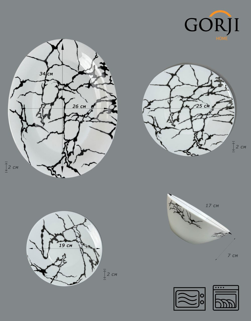 - 6 ас табақ D 25 см, 6 десерт табақ D 19,5 см, 1 сопақ табақ D 26*34 см, 6 сорпа табақ D 17 см, биіктігі 7 см