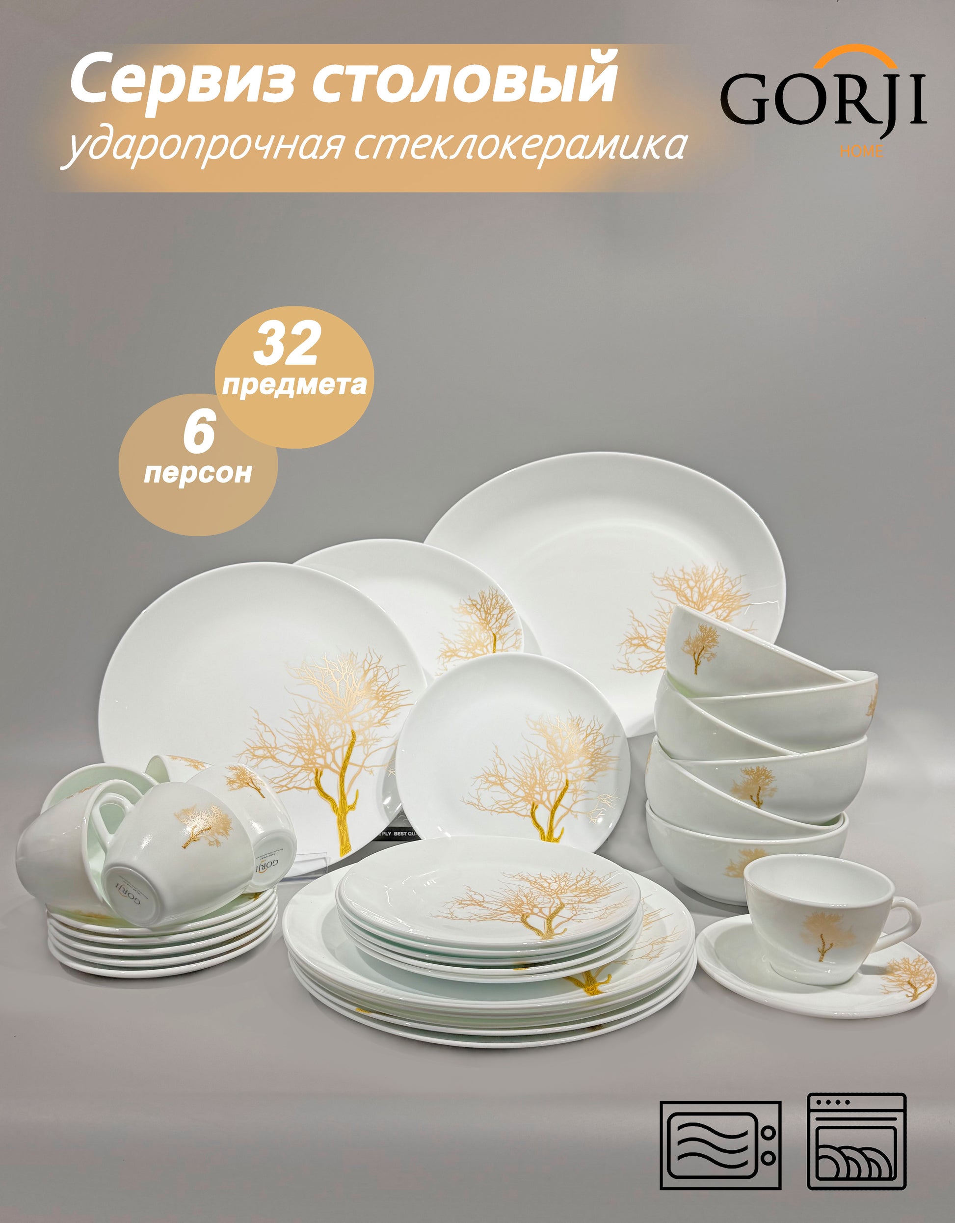 - 6 адамға арналған 32 бөліктен тұратын ыдыс-аяқ, отбасылық тағамдарға өте ыңғайлы