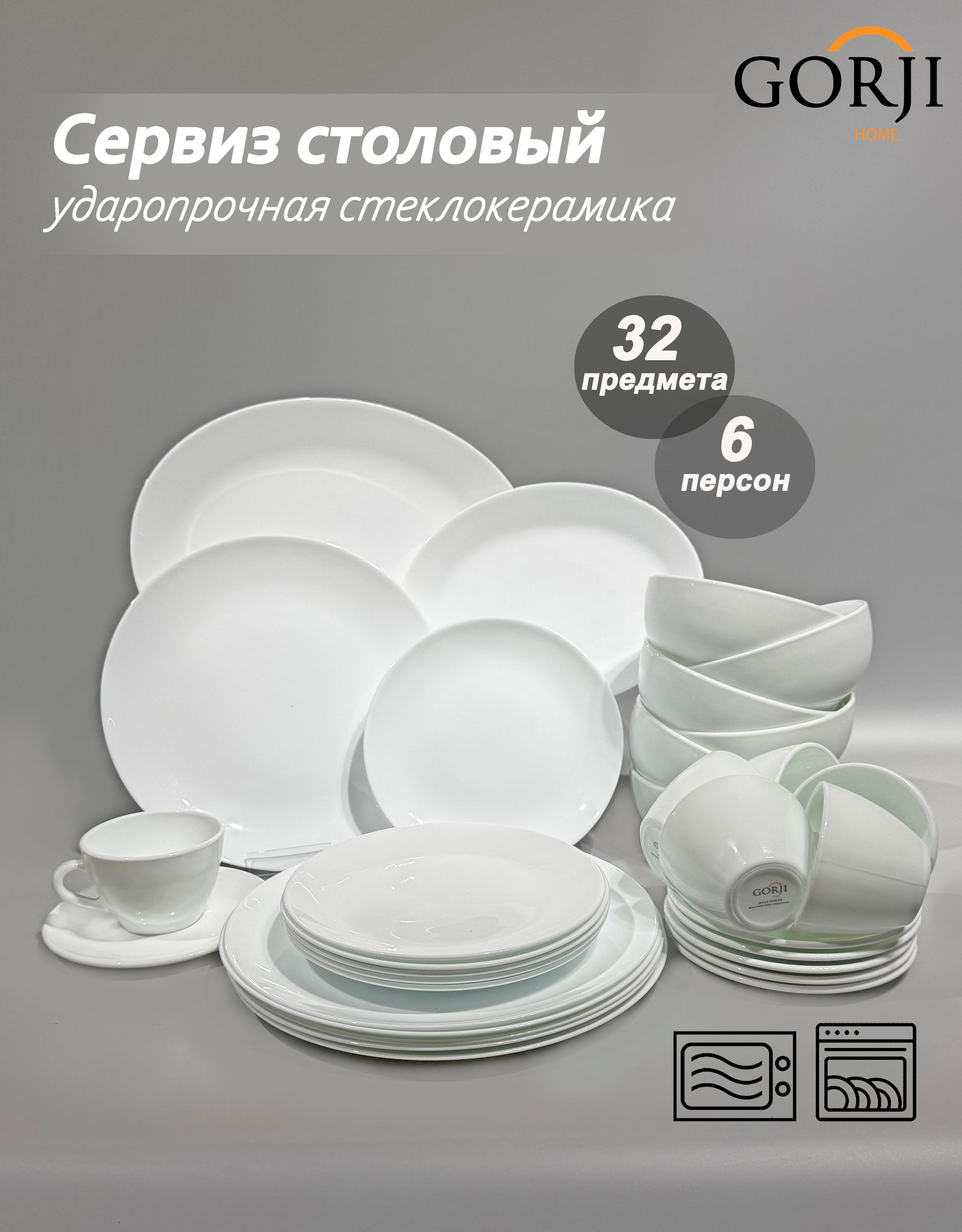 - 6 адамға арналған 32 бөліктен тұратын ыдыс-аяқ, отбасылық тағамдарға өте ыңғайлы