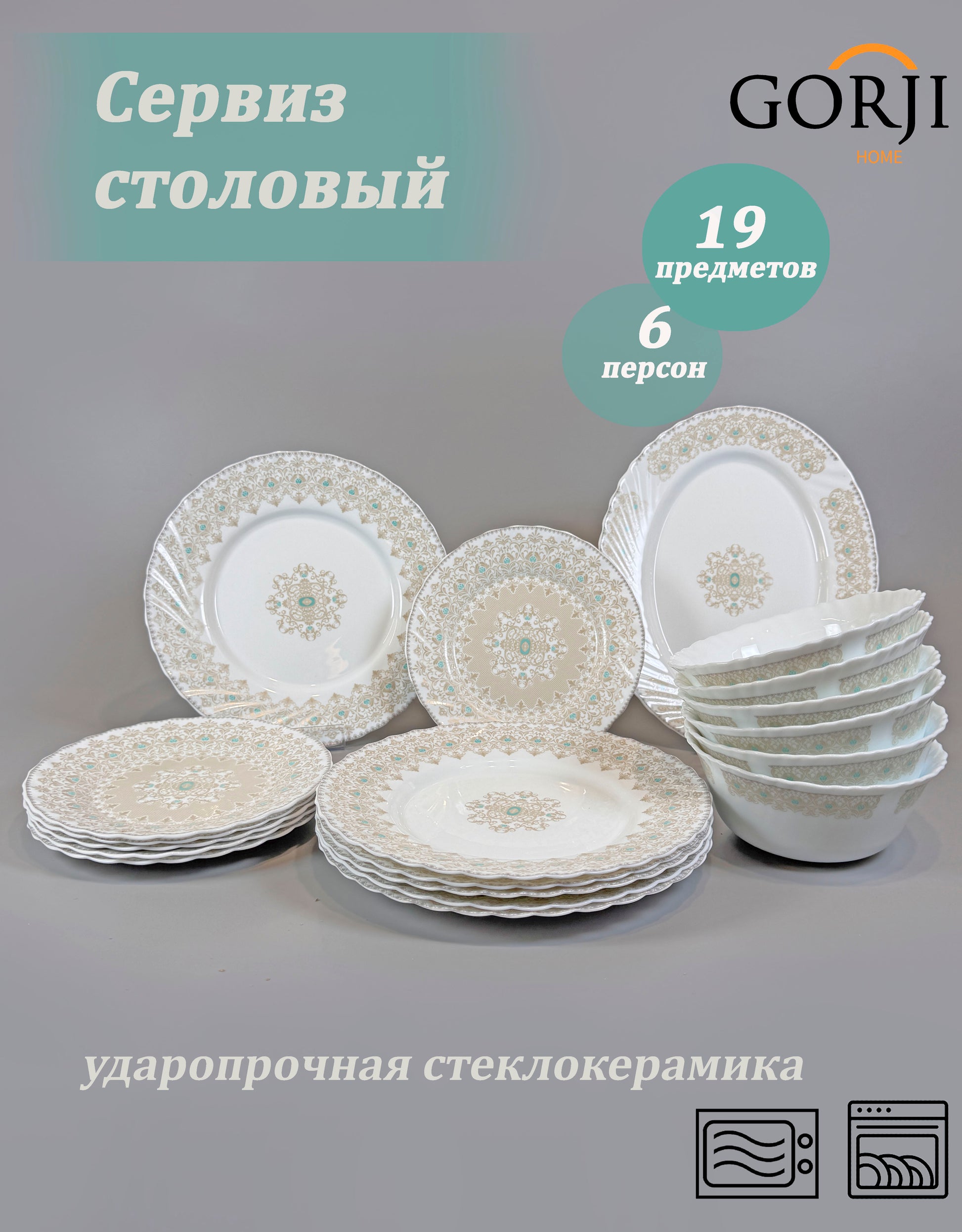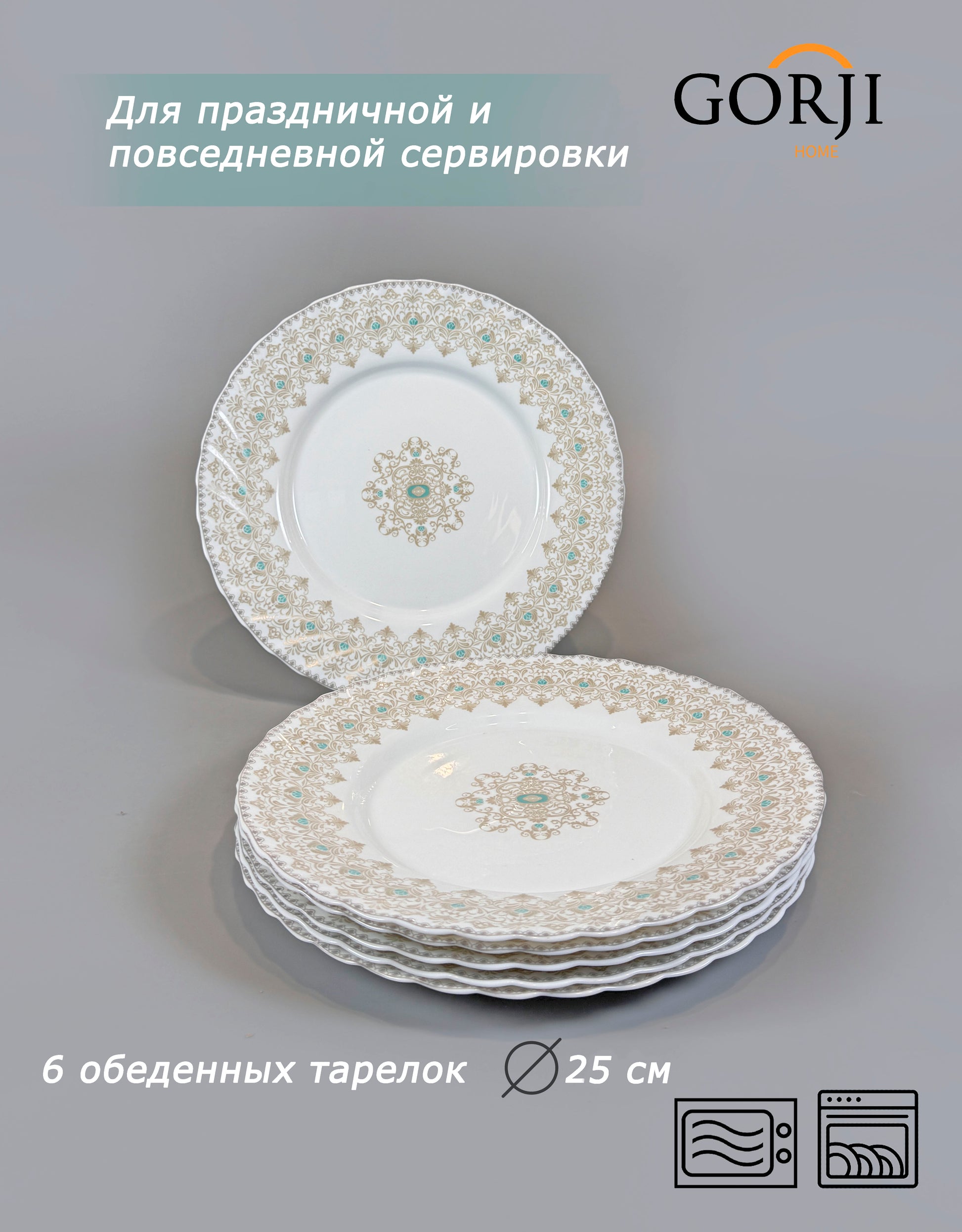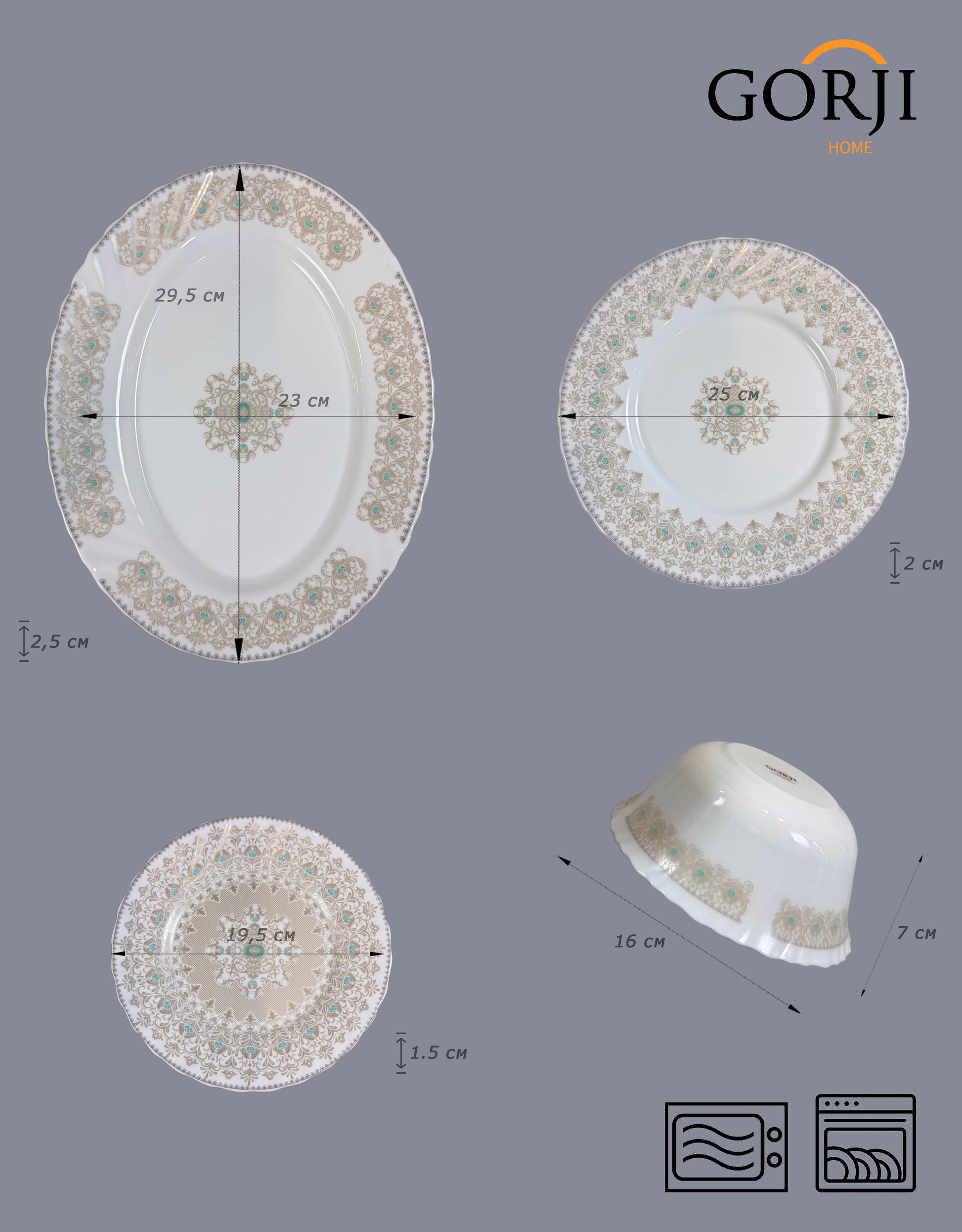 - 6 dinner plates \25cm\2cm 6 soup plates \16.7cm\7cm\750ml 6 dessert plates \19.5cm\2cm Oval dish \22.6*30cm\2.3cm