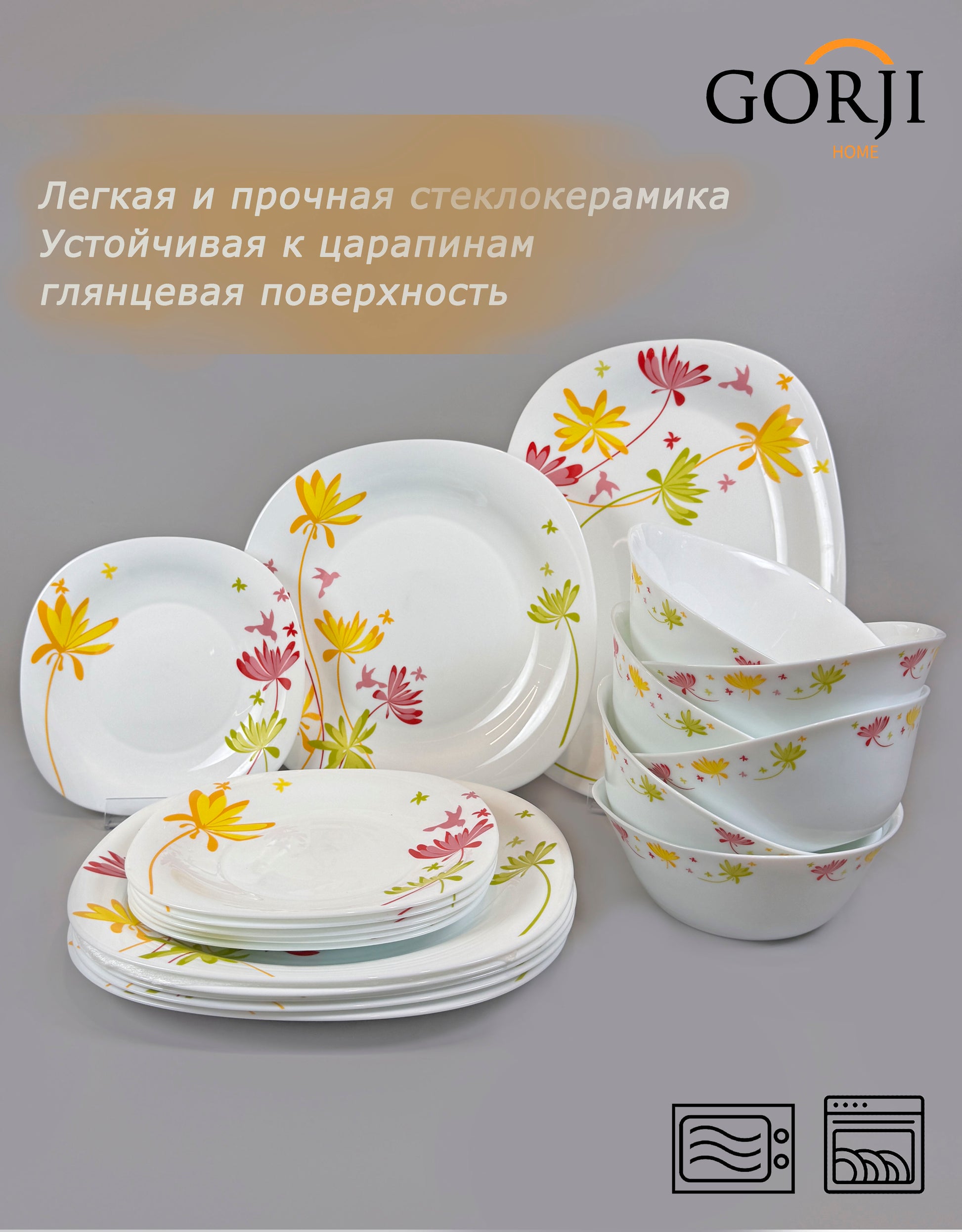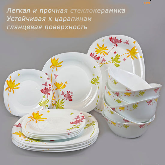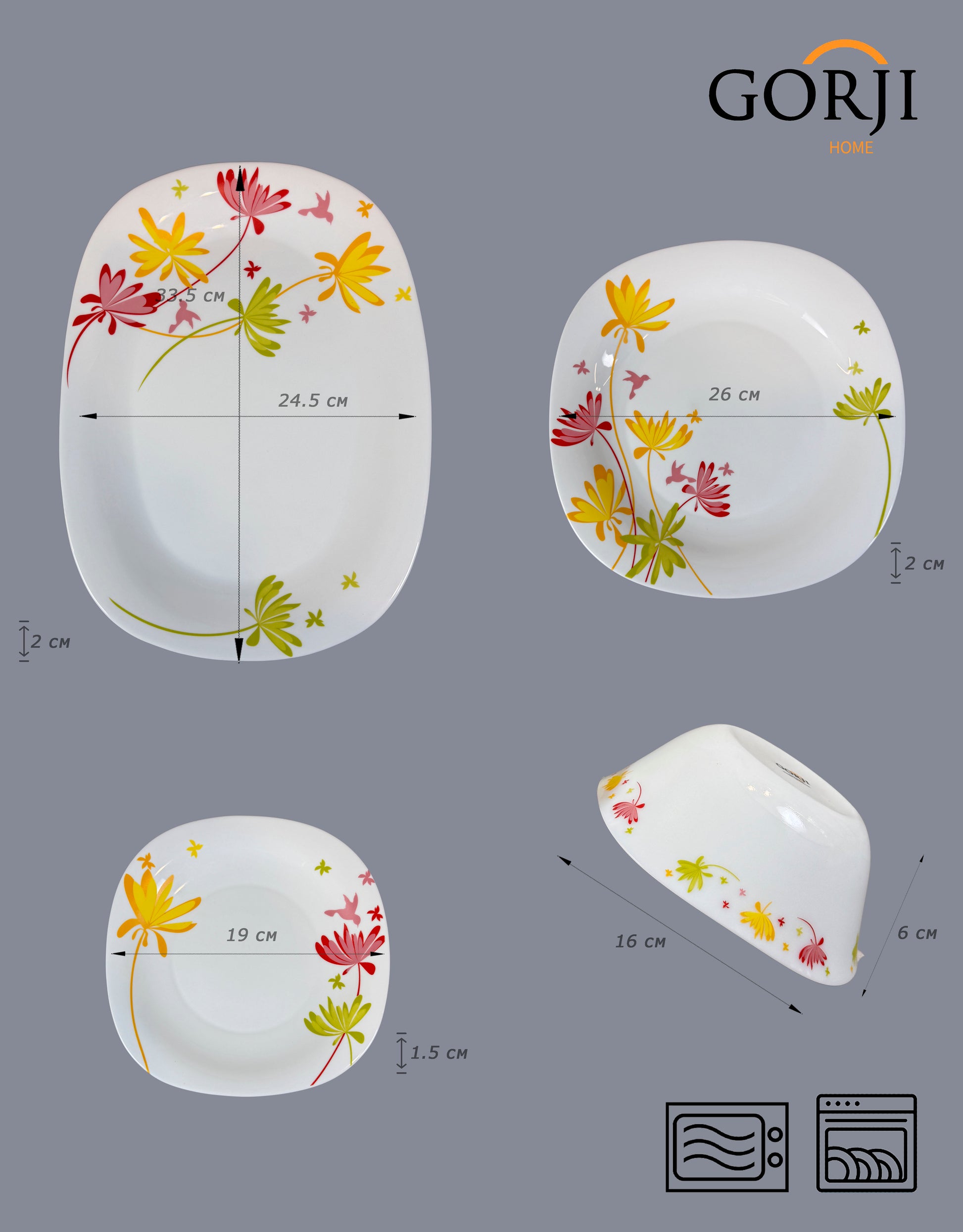 The set is made of opal glass, making it particularly durable. The plates have a glossy, smooth, non-porous surface, preventing the accumulation of food particles and protecting against bacteria and plaque. The dishes do not absorb odors, colors, or liquids, making them completely safe and suitable for use in homes with small children and those with allergies. The design is printed using a special technology, making the set dishwasher and microwave safe. The glass-ceramic plates are lightweight and durable, much lighter and thinner than ceramic, and scratch-resistant.