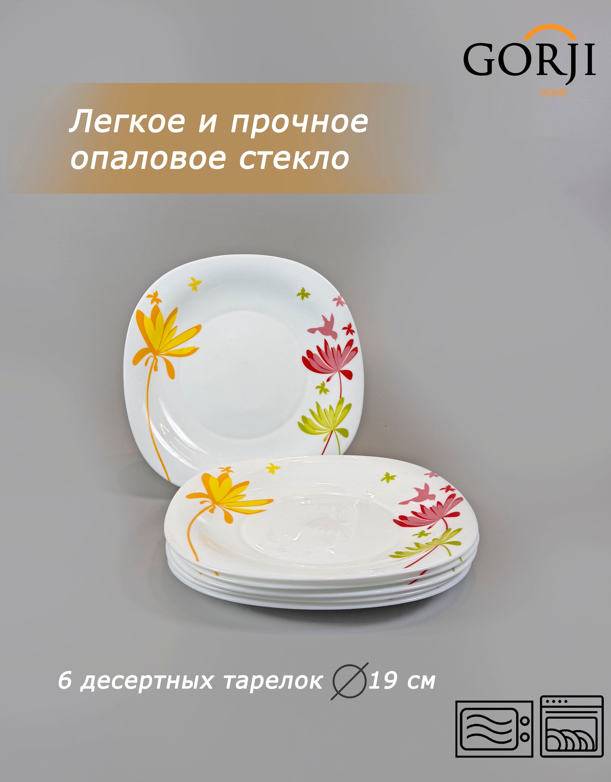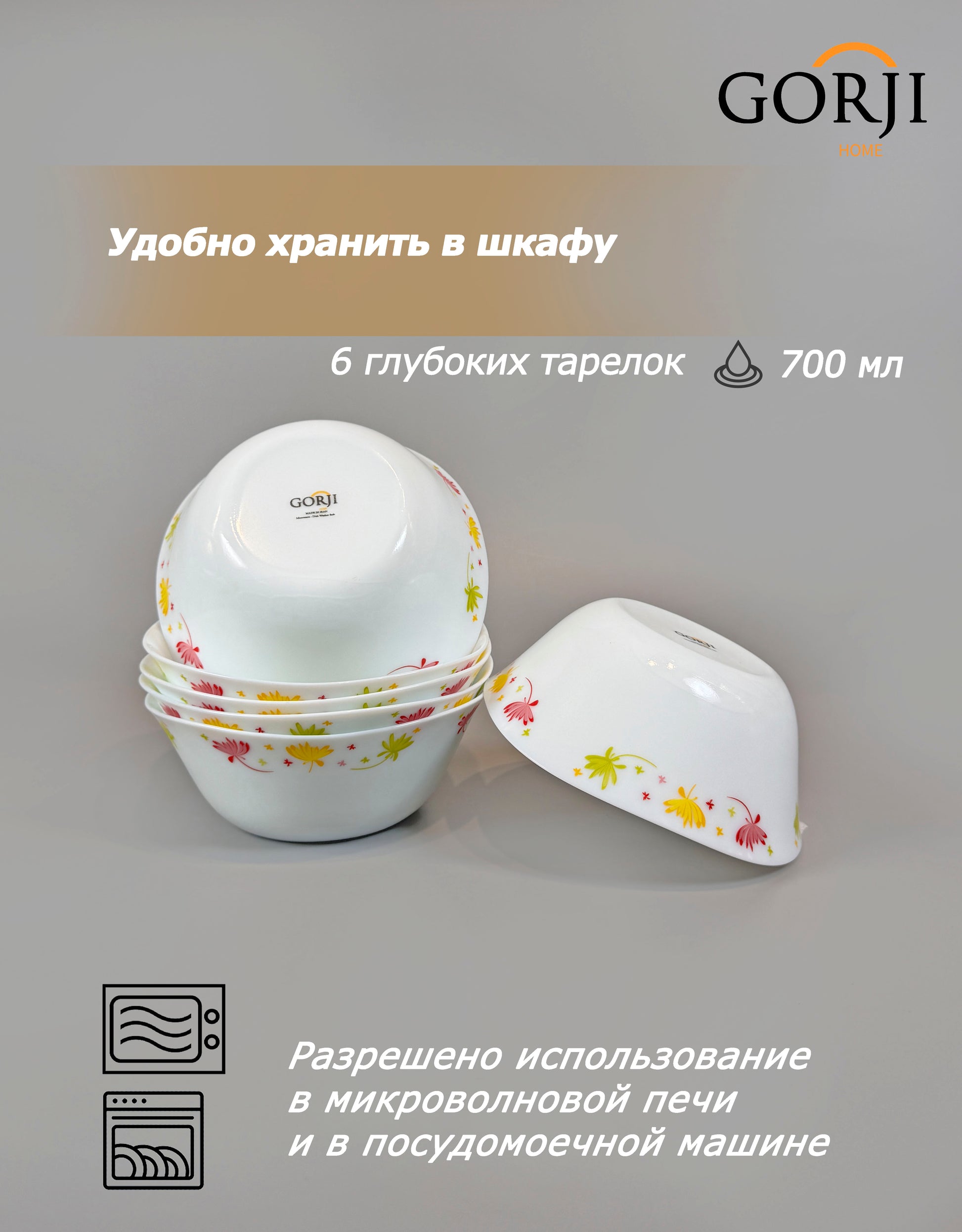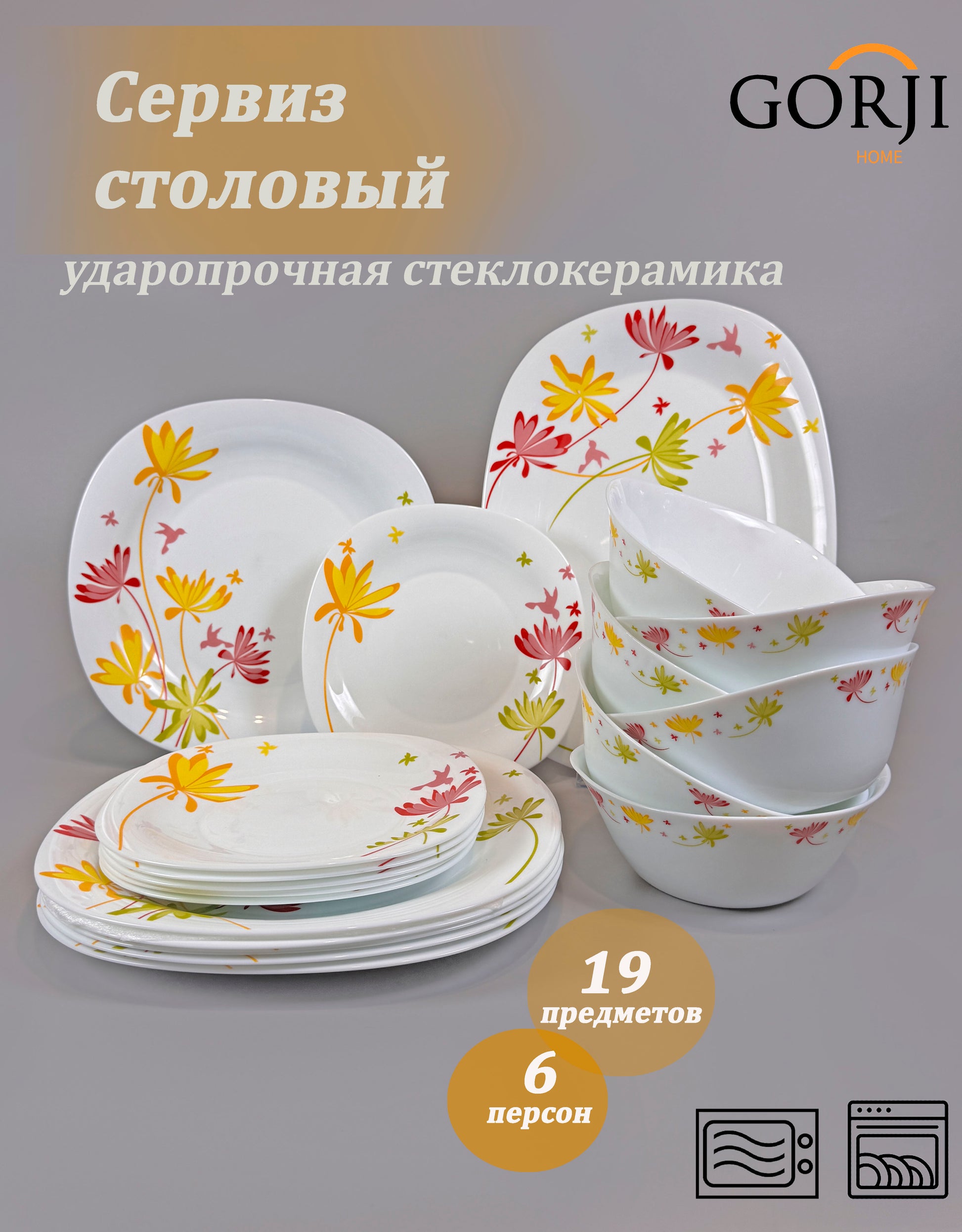 The set is made of opal glass, making it particularly durable. The plates have a glossy, smooth, non-porous surface, preventing the accumulation of food particles and protecting against bacteria and plaque. The dishes do not absorb odors, colors, or liquids, making them completely safe and suitable for use in homes with small children and those with allergies. The design is printed using a special technology, making the set dishwasher and microwave safe. The glass-ceramic plates are lightweight and durable, much lighter and thinner than ceramic, and scratch-resistant.